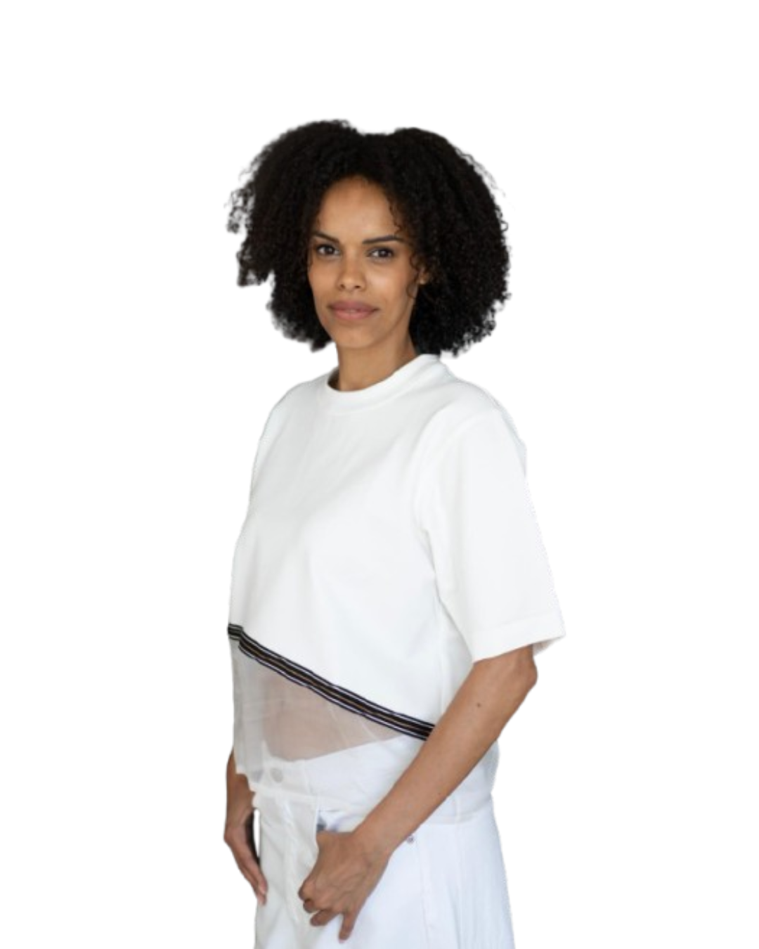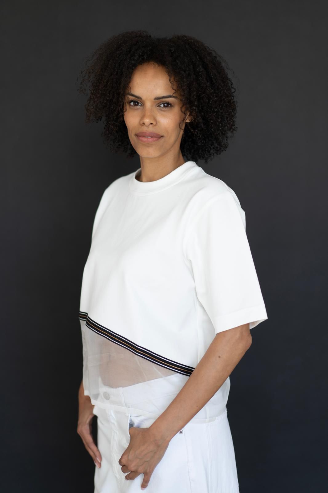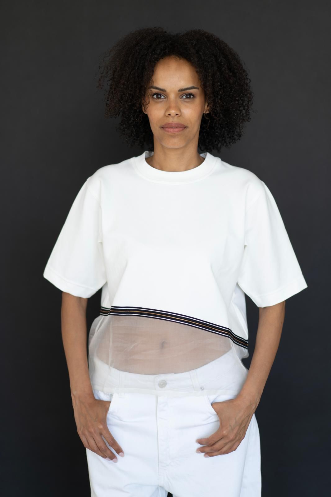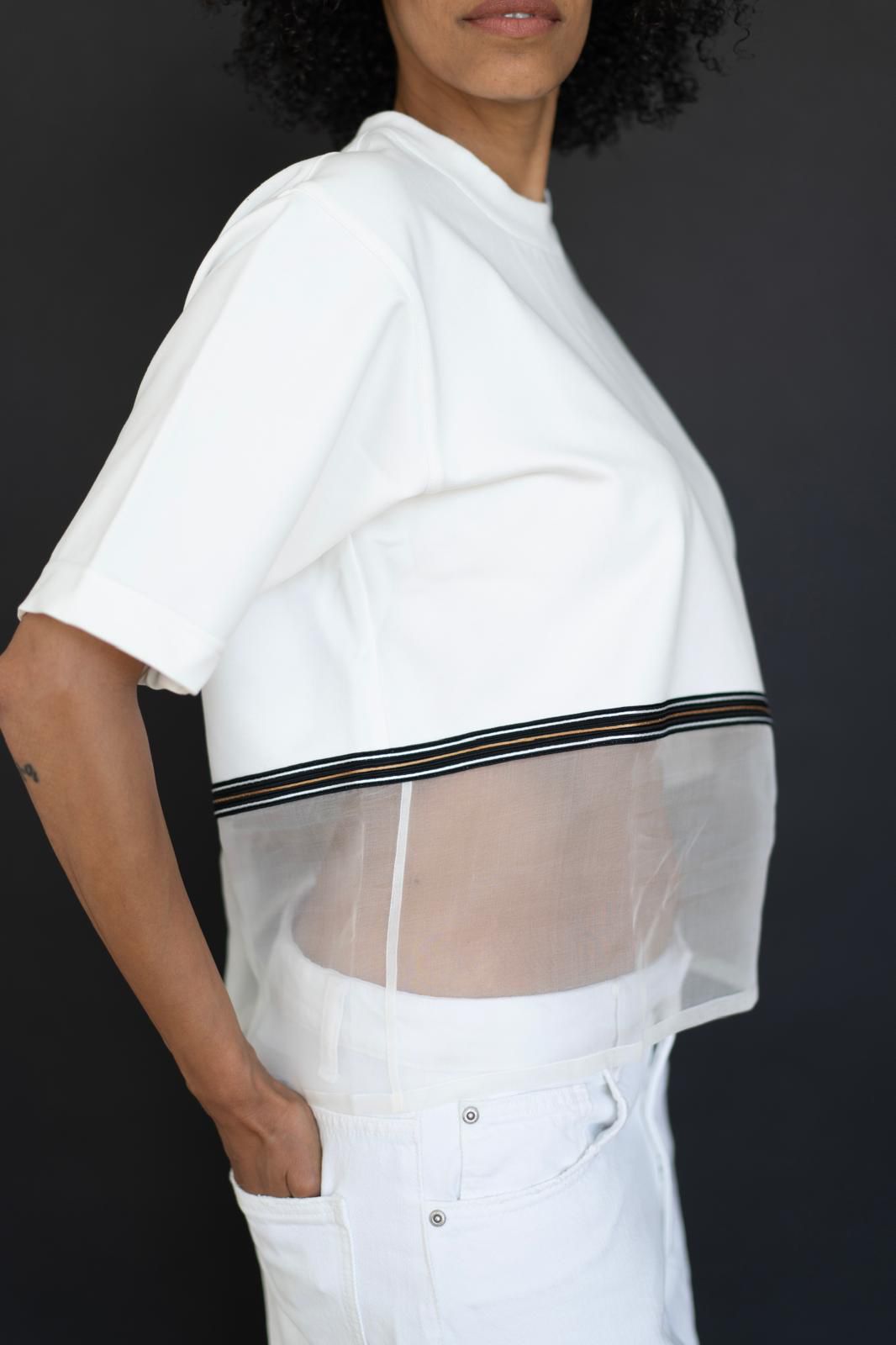 T-shirt in Punto Milano dalla linea femminile, con inserto in organza di seta e ricamo a contrasto. Design es- senziale con dettagli sartoriali. Disponibile in due taglie: S/M e L/XL.